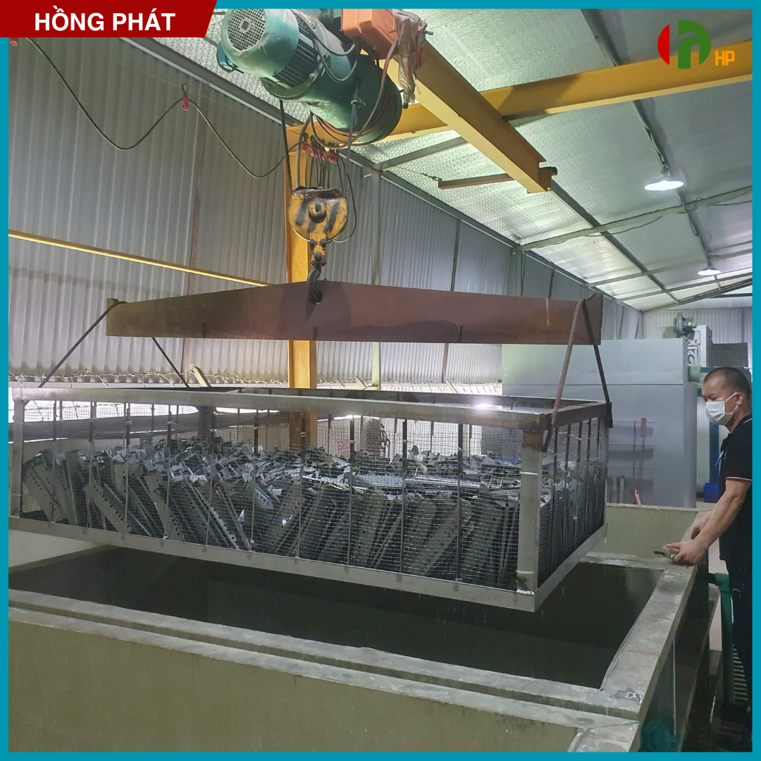 Sau khi hàn tiến hành mài các mối hàn, các chi tiết thừa, sau đó sản phẩm được đưa qua bể xử lý hoá chất hoặc máy phun bi cát, tuỳ thuộc vào loại sản phẩm mà đưa tới các công đoạn xử lý khác nhau để loại bỏ bụi bẩn, gỉ sét, dầu mỡ còn bám trên bề mặt kim loại